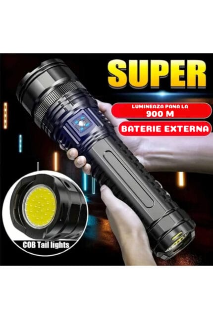Lanterna LED tactica de mana, baterie de inalta calitate 15000 mAh, COB, zoom puternic pana la 900m