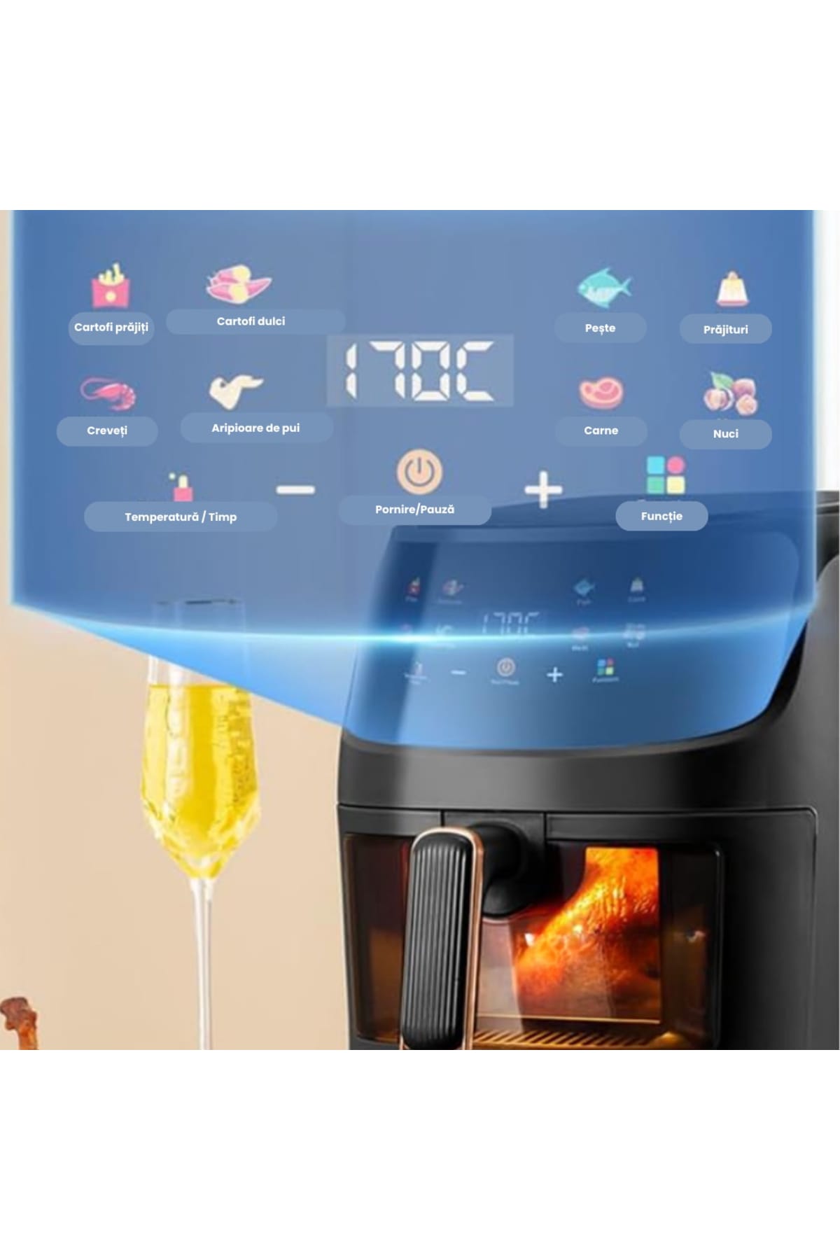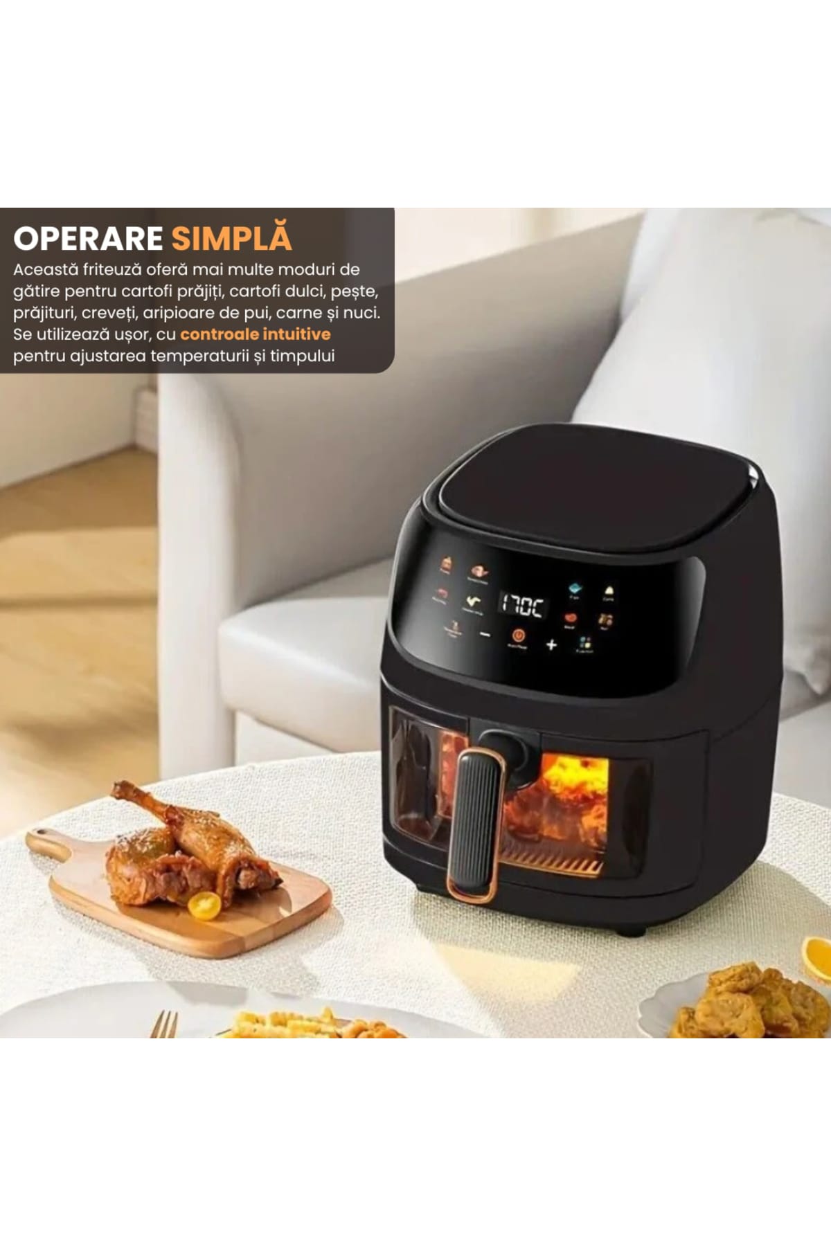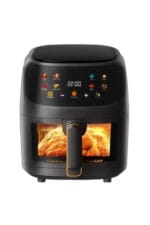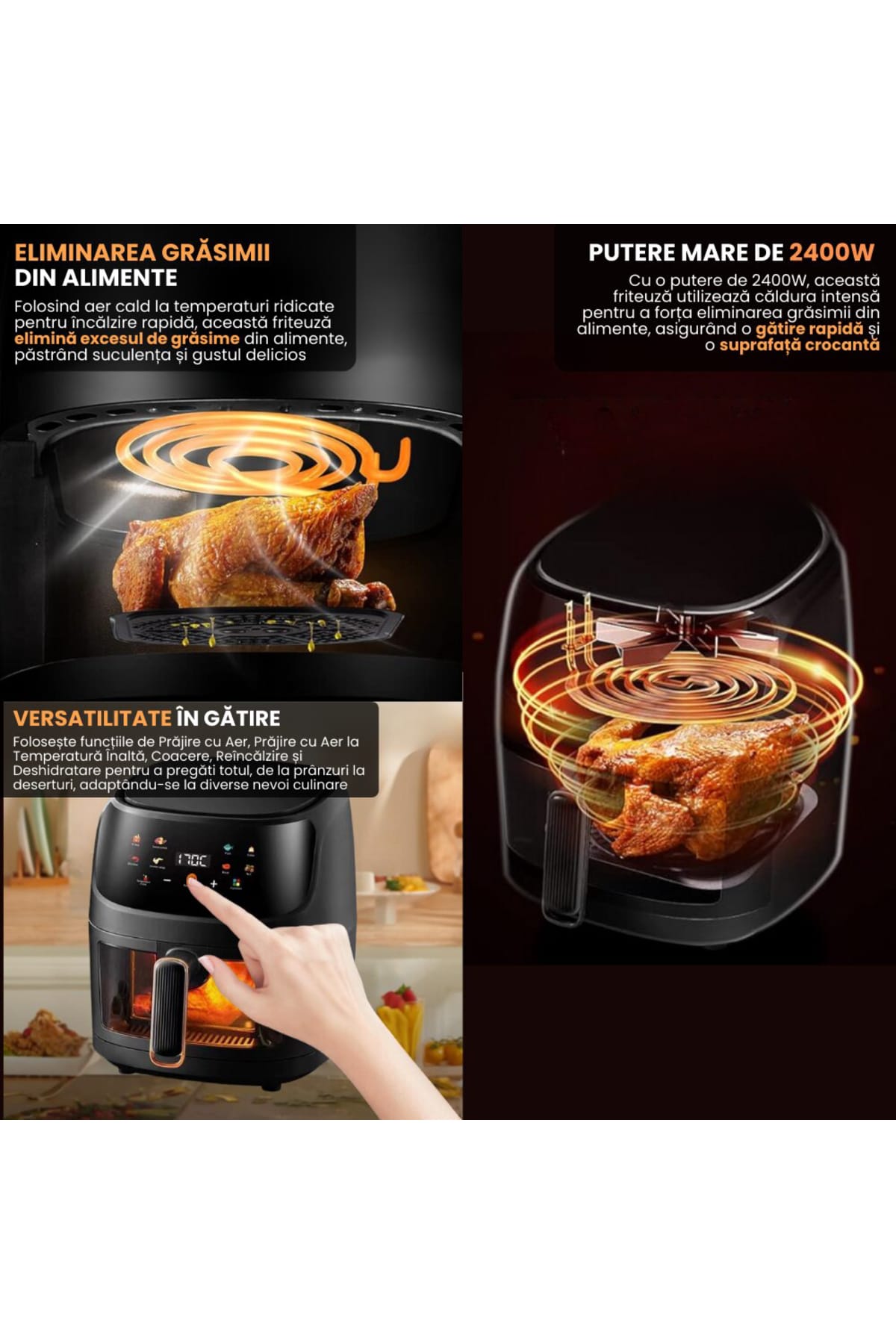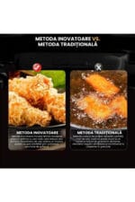 Air Fryer, friteuza cu aer cald, 8l, 2400W, afisaj digital, control tactil Gătește rapid, gustos și sănătos cu această friteuză cu aer cald tip cuptor, echipată cu display digital și funcții multiple precum coacere, prăjire sau reîncălzire.; Cu o capacitate impresionantă de 10 litri, este alegerea ideală pentru familii sau pasionații de gătit.; Caracteristici generale: Capacitate mare de 8L– ideală pentru porții multiple sau mese în familie.; Display digital intuitiv cu panou touch – control ușor al funcțiilor.; Funcții multiple: prăjire cu aer cald, coacere, grill, reîncălzire și uscare.; Circulație uniformă a aerului cald – gătire eficientă fără ulei.; Design modern tip cuptor – cu ușă transparentă și rafturi interioare.; Beneficii cheie: Gătire fără ulei – reduce grăsimile din mâncare cu până la 80%.; Versatilitate maximă – înlocuiește cuptorul, prăjitorul și grillul.; Ușor de curățat – componente detașabile lavabile în mașina de spălat vase.; Gătire rapidă și uniformă – economisește timp și energie.; Ideală pentru rețete variate: pui, legume, pizza, cartofi sau prăjituri.; Specificații tehnice: Putere: 2400W Capacitate: 8 litri Tensiune: 220V – 240V Control: Digital, touch screen Timer: Da Funcții automate: Da Dimensiuni: aproximativ 35 x 35 x 38 cm Greutate: ~6,5 kg Recomandări: Această friteuză cu aer cald tip cuptor este soluția ideală pentru cei care doresc să gătească sănătos, diversificat și rapid.; Cu un design modern și capacitate mare, este perfectă pentru orice bucătărie care îmbină funcționalitatea cu stilul.