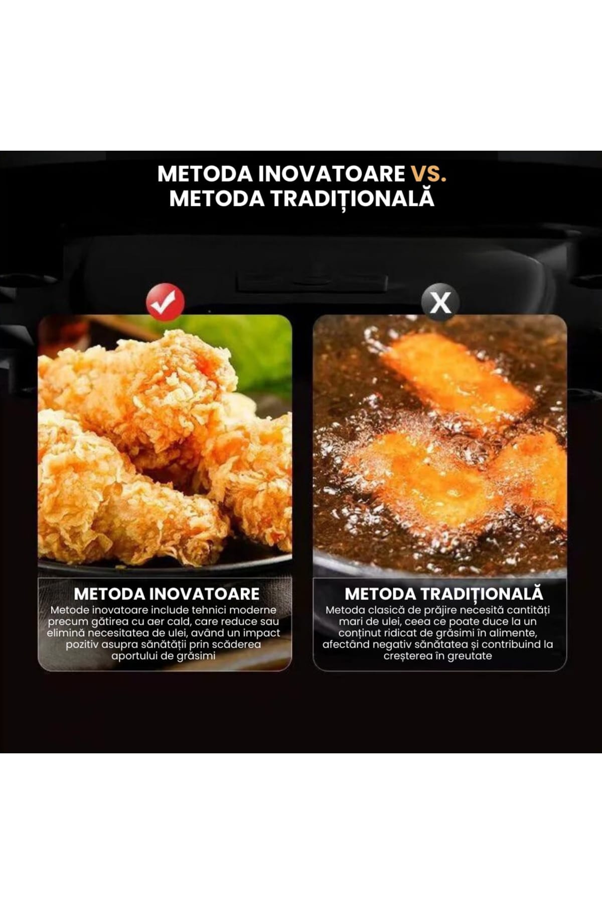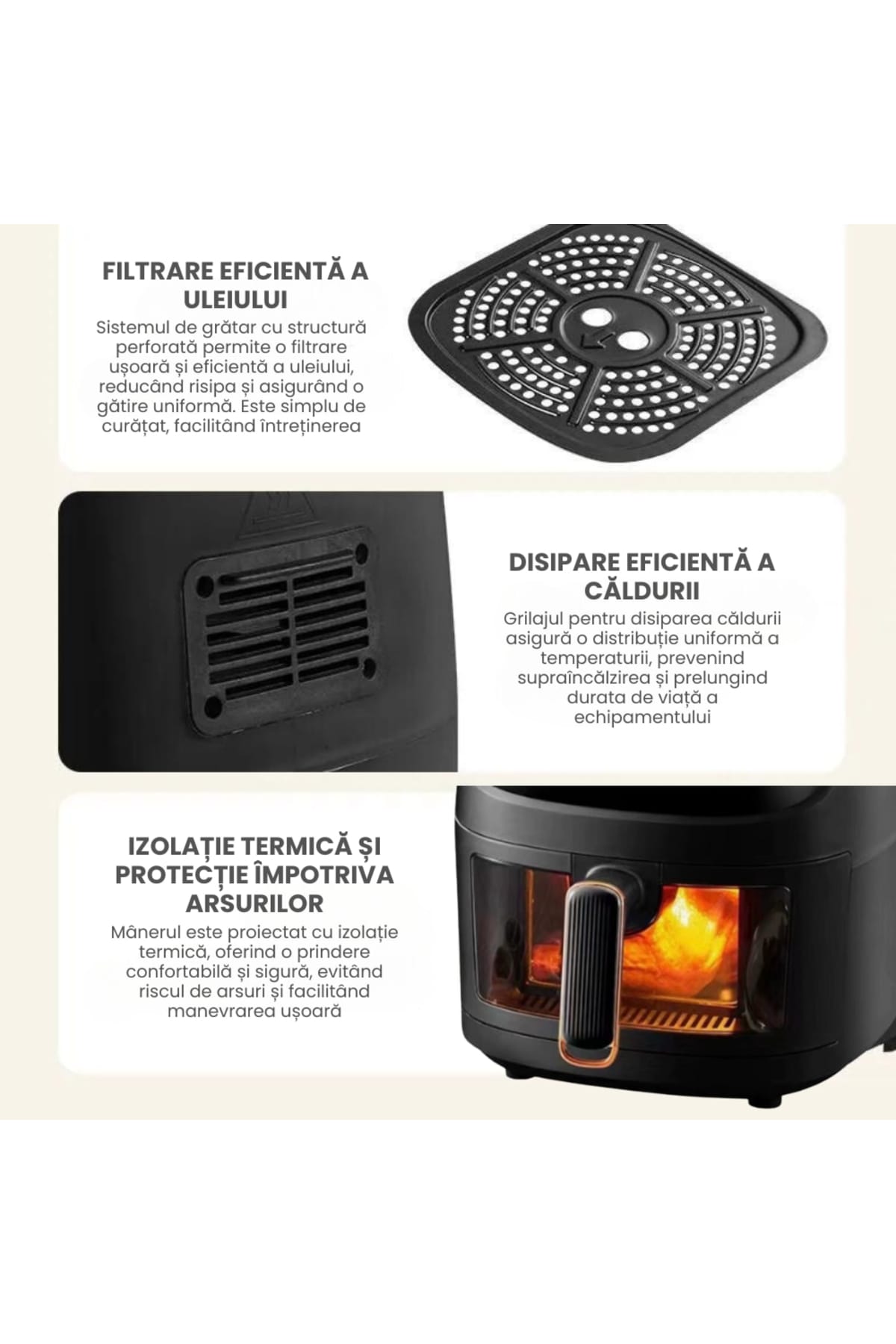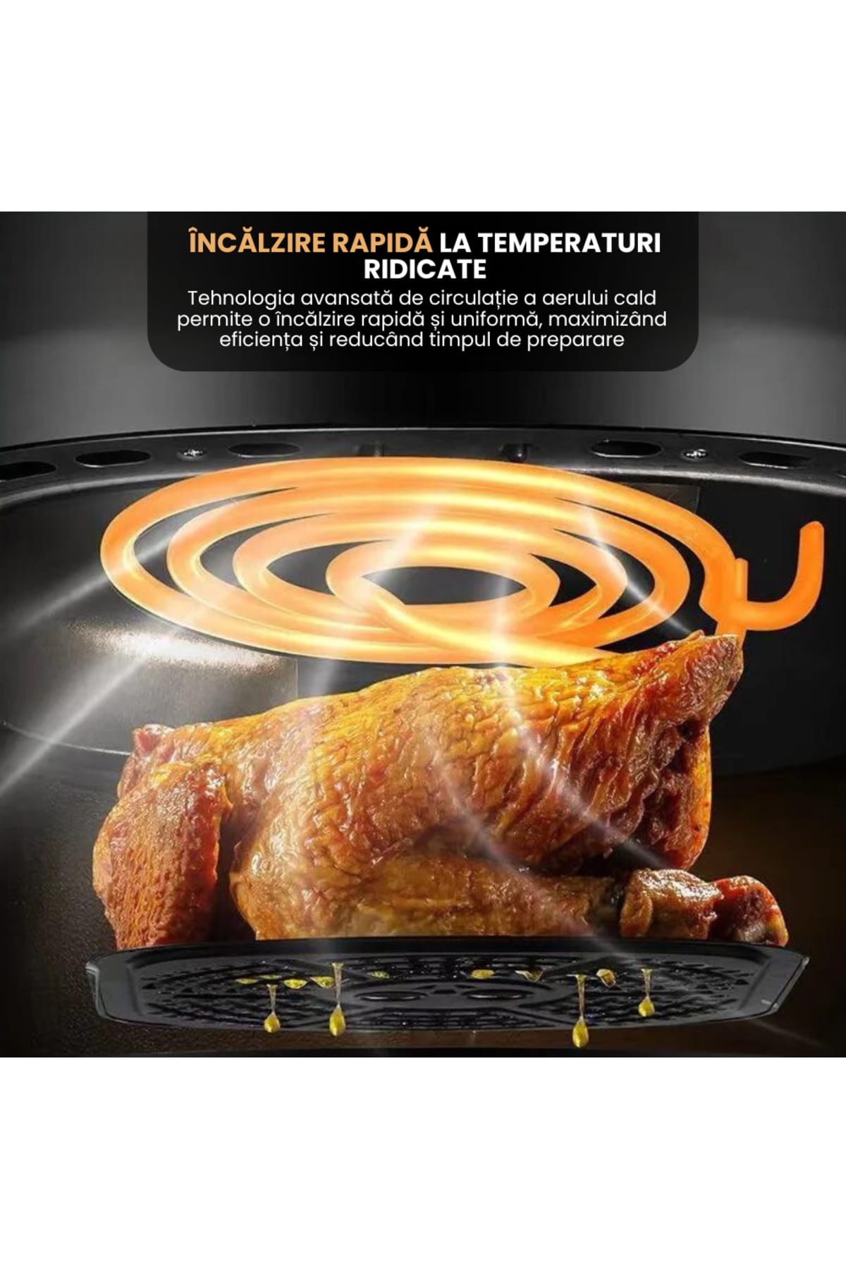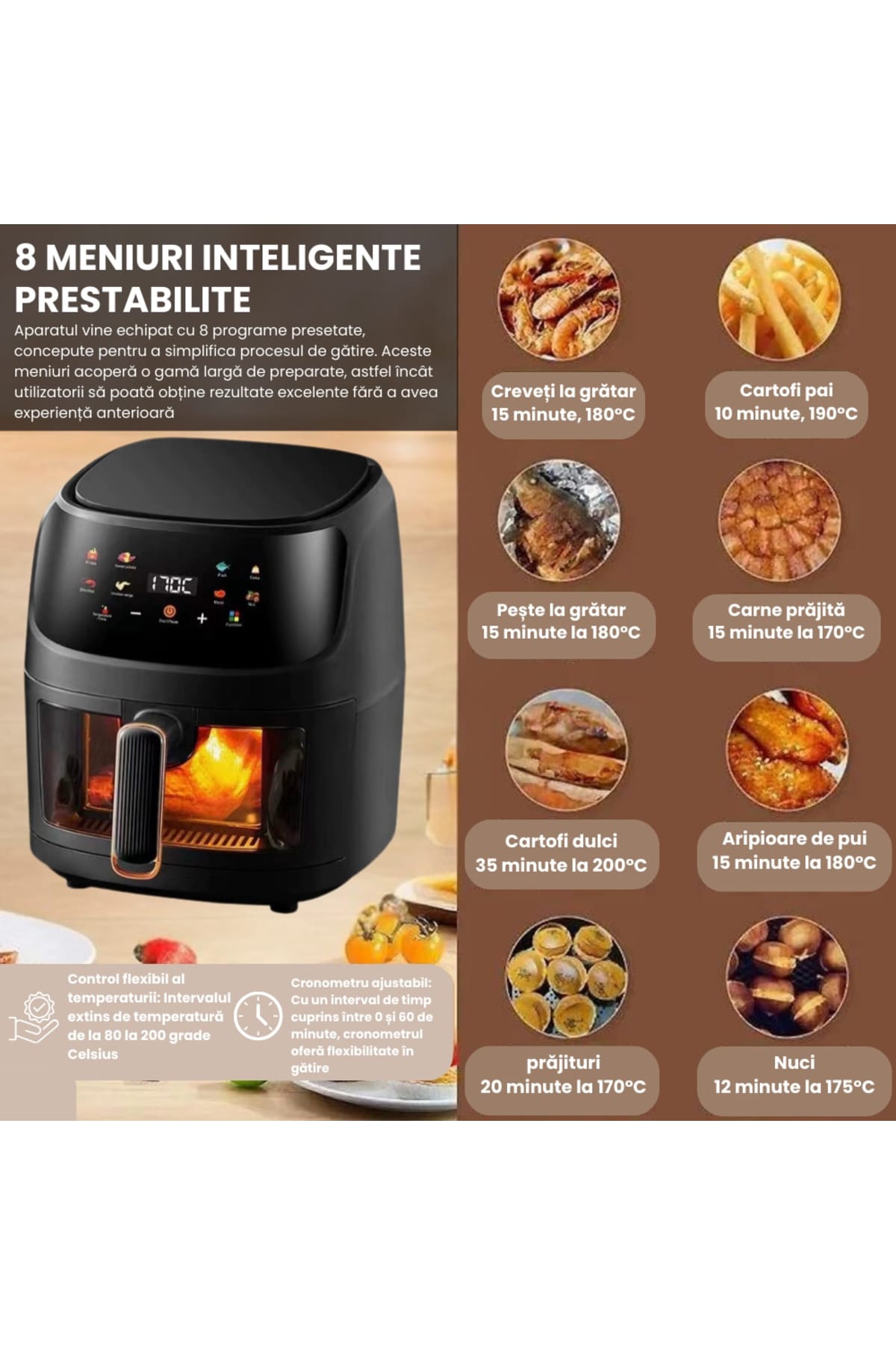 Air Fryer, friteuza cu aer cald, 8l, 2400W, afisaj digital, control tactil Gătește rapid, gustos și sănătos cu această friteuză cu aer cald tip cuptor, echipată cu display digital și funcții multiple precum coacere, prăjire sau reîncălzire.; Cu o capacitate impresionantă de 10 litri, este alegerea ideală pentru familii sau pasionații de gătit.; Caracteristici generale: Capacitate mare de 8L– ideală pentru porții multiple sau mese în familie.; Display digital intuitiv cu panou touch – control ușor al funcțiilor.; Funcții multiple: prăjire cu aer cald, coacere, grill, reîncălzire și uscare.; Circulație uniformă a aerului cald – gătire eficientă fără ulei.; Design modern tip cuptor – cu ușă transparentă și rafturi interioare.; Beneficii cheie: Gătire fără ulei – reduce grăsimile din mâncare cu până la 80%.; Versatilitate maximă – înlocuiește cuptorul, prăjitorul și grillul.; Ușor de curățat – componente detașabile lavabile în mașina de spălat vase.; Gătire rapidă și uniformă – economisește timp și energie.; Ideală pentru rețete variate: pui, legume, pizza, cartofi sau prăjituri.; Specificații tehnice: Putere: 2400W Capacitate: 8 litri Tensiune: 220V – 240V Control: Digital, touch screen Timer: Da Funcții automate: Da Dimensiuni: aproximativ 35 x 35 x 38 cm Greutate: ~6,5 kg Recomandări: Această friteuză cu aer cald tip cuptor este soluția ideală pentru cei care doresc să gătească sănătos, diversificat și rapid.; Cu un design modern și capacitate mare, este perfectă pentru orice bucătărie care îmbină funcționalitatea cu stilul.