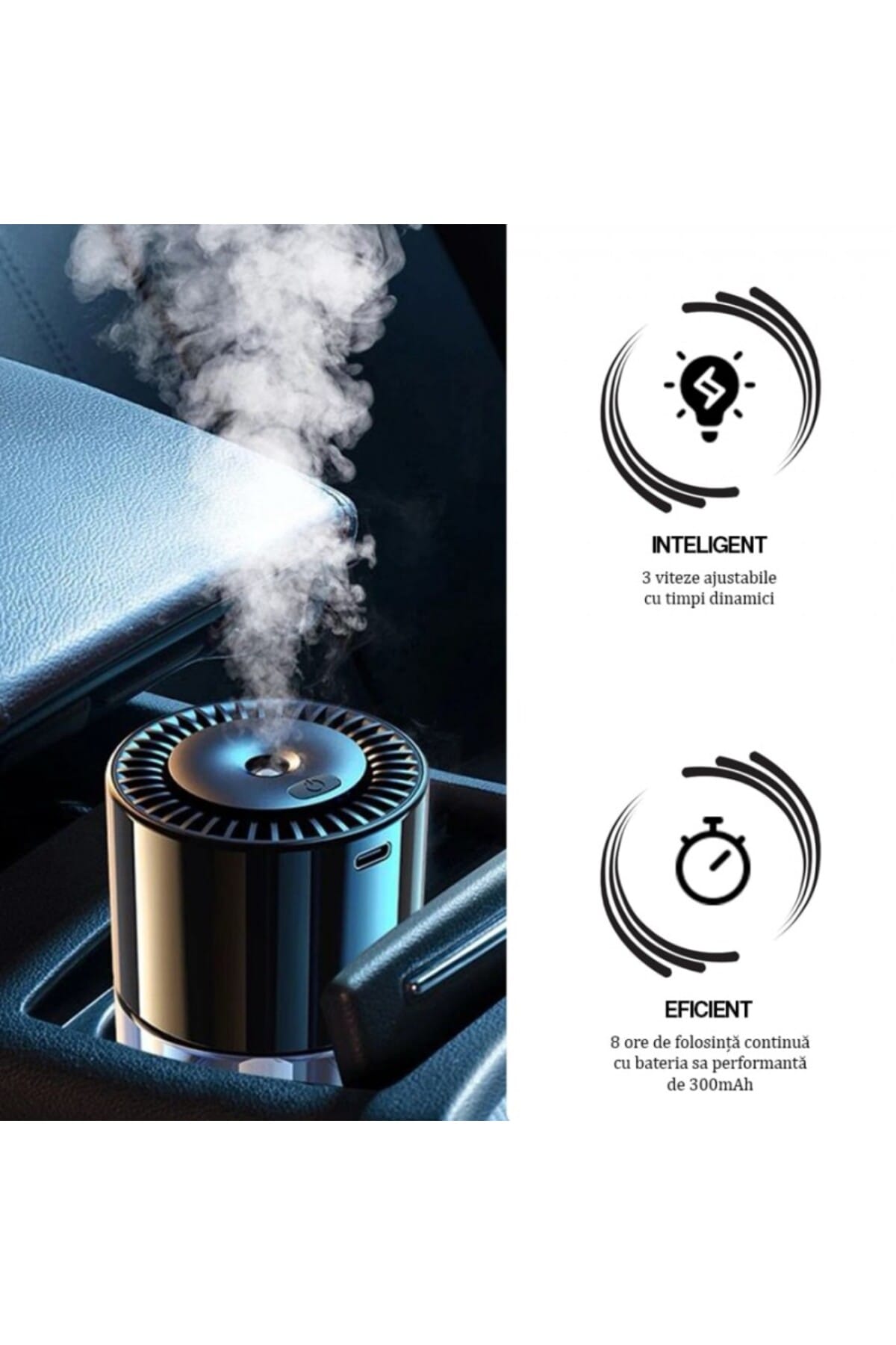 Descopera un mod inteligent si eficient de a imbunatati atmosfera din masina, birou sau locuinta ta cu acest difuzor profesional de aromaterapie.; Cu un design modern si tehnologie de ultima generatie, acest dispozitiv iti permite sa te bucuri de beneficiile aromaterapiei oriunde te-ai afla.; Performanta si Portabilitate Difuzorul este compact, reincarcabil si ofera control asupra intensitatii difuzarii.; Utilizare: Ideal pentru auto, casa si birou.; Capacitate: 160 ml, permitand utilizare indelungata fara reumpleri frecvente.; Trepte de Putere: Dotat cu 4 trepte de putere (sau 3 viteze ajustabile, conform textului, se va folosi informatia din titlu: 4 trepte de putere).; Portabil: Compact si portabil, avand dimensiunile de 16.5 cm x 8 cm.; Functii: Contribuie la purificarea aerului si eliminarea mirosurilor neplacute.; Acumulator si Incarcare Rapida Acumulator: Baterie performanta de 300mAh.; Autonomie: Asigura pana la 8 ore de utilizare continua.; Incarcare: Alimentare prin USB Type-C, incarcarea se face rapid si usor.; Compatibilitate si Design Compatibilitate: Compatibil cu uleiuri esentiale pentru o experienta personalizata.; Design: Design elegant, cu linii sofisticate si materiale premium, se integreaza perfect in orice decor.; Specificatii Cheie Utilizare: Auto, Casa, Birou Acumulator: 300mAh Autonomie: 8 ore Incarcare: USB Type-C Capacitate: 160 ml Trepte Putere: 4 Dimensiuni: 16.5 cm x 8 cm