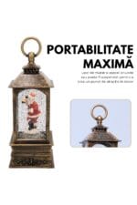 Figurina Mos Craciun este detaliata cu grija, iar luminile calde LED ofera o stralucire placuta, ideala pentru serile de sarbatoare.; Caracteristici:Tip produs: felinar decorativ muzicalTematica: Mos Craciun, peisaj de iarnaIluminare: LED caldMuzica: 1 melodie de Craciun integrataAlimentare: poate fi alimentat cu 3 baterii AA (NU sunt incluse) sau poate fi alimentat prin cablul USB la DC (inclus)Materiale: plastic ABS + plexiglas + rasinaDimensiuni: 8*8*22 cm