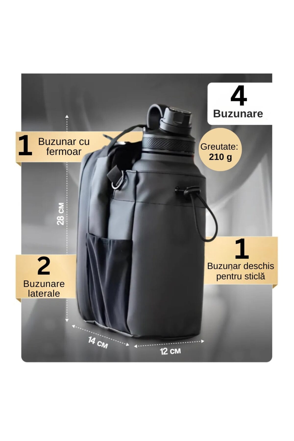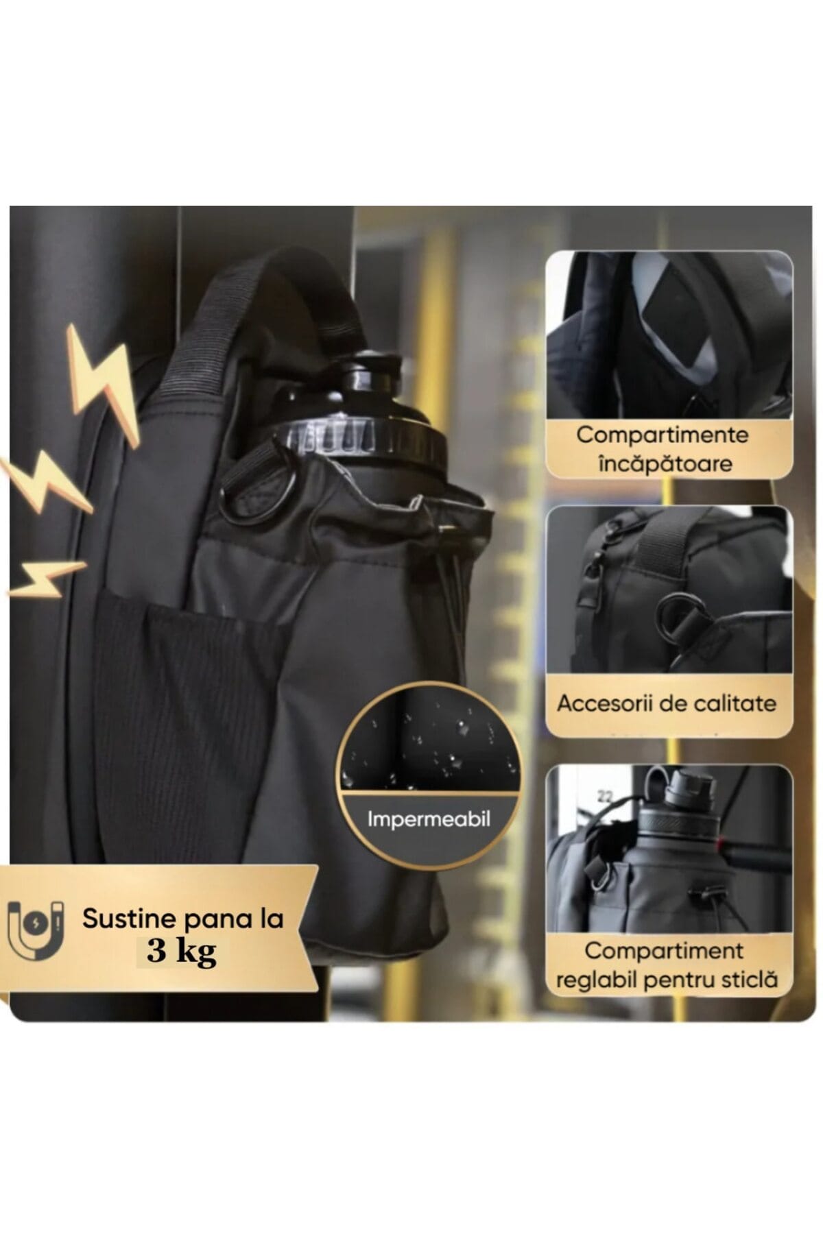 Transforma-ti antrenamentul cu aceasta geanta de sala inovatoare, conceputa pentru a-ti pastra obiectele personale in siguranta si la indemana.; Un accesoriu esential pentru stilul tau de viata activ, combinand fixarea magnetica cu o constructie robusta si compartimente inteligente.; Fixare Magnetica Inteligenta si SiguraElementul distinctiv al gentii este sistemul de fixare magnetica inteligenta.; Doi magneti puternici integrati permit atasarea ferma pe orice suprafata metalica din sala (aparat de fitness, dulap, bara).; Protectie si Igiena: Acest sistem elimina necesitatea de a lasa geanta pe podelele murdare sau umede ale salii, protejand astfel obiectele personale de murdarie si deteriorare.; Acces Rapid: Ai acces rapid si sigur la lucrurile esentiale in timpul antrenamentelor.; Constructie Durabila si Compartimentare EficientaGeanta este realizata din materiale premium, special alese pentru a rezista la utilizare intensa si uzura zilnica.; Tesatura exterioara impermeabila protejeaza eficient continutul de stropi de apa, transpiratie sau murdarie.; Compartiment Sticla: Compartimentul frontal include un suport dedicat pentru sticle de apa, compatibil cu majoritatea sticlelor standard (900 ml pana la 1,5 L).; Organizare Optima: Doua buzunare laterale sunt ideale pentru telefon, prosop sau casti.; Buzunarul principal cu fermoar este perfect pentru bunurile de valoare (portofel, carduri, chei) si include un carlig practic pentru agatarea cheilor.; Versatilitate si Purtare MultiplaDesignul modern si unisex face aceasta geanta ideala pentru femei si barbati.; Se adapteaza usor oricarei situatii, de la sala la escapade in aer liber.; Optiuni de Purtare: Poate fi tinuta in mana (manere rezistente), pe umar sau purtata ca geanta crossbody (folosind cureaua lunga, reglabila).; De Ce sa Alegi Aceasta Geanta:Fixare Magnetica Sigura: Se prinde usor de aparatele din sala, fara sa atarne pe jos.; Material Impermeabil: Protejeaza lucrurile de umezeala si murdarie.; Compartimente Inteligente: Spatiu special pentru sticla, telefon si chei.; Utilizare Versatila: Perfecta pentru sala, drumetii, sporturi sau calatorii.