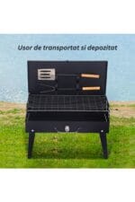 Transforma orice iesire in aer liber intr-o experienta culinara de neuitat cu acest Gratar Portabil Pliabil, partenerul ideal pentru picnicuri, camping sau gratare in curte.; Proiectat pentru a imbina portabilitatea cu performanta, acesta se pliaza intr-o forma compacta, similara unei serviete, facilitand transportul.; Portabilitate si Design PliabilGratarul este ideal pentru calatorii si depozitare facila.; Tip Servieta: Design complet pliabil, care se strange intr-o forma compacta, usor de transportat si de depozitat, economisind spatiu.; Portabil: Usor de luat oriunde ai nevoie de el (pentru picnicuri, camping sau curte).; Dimensiuni Compacte: Dimensiunile de utilizare sunt de aproximativ 46 x 43 cm (cu inaltime de 26 cm, conform dimensiunii mentionate in text).; Constructie Durabila si PerformantaMaterial: Fabricat din metal durabil, asigurand o utilizare de lunga durata.; Distributie Caldura: Asigura o distributie uniforma a caldurii, oferindu-ti rezultate perfecte de fiecare data cand gatesti.; Culoare: Negru elegant, conferind un aspect modern si sofisticat.; Accesorii IncluseGata de Gatit: Gratarul vine cu Accesorii Esentiale pentru Gatit Incluse, astfel incat sa fii mereu pregatit.; Specificatii CheieTip: Gratar Portabil PliabilForma: Servieta (Pliabil)Material: Metalic (Durabil)Dimensiuni (Utilizare): Aproximativ 46 x 43 cmAccesorii: IncluseCuloare: NegruUtilizare: Picnic, Camping, Curte