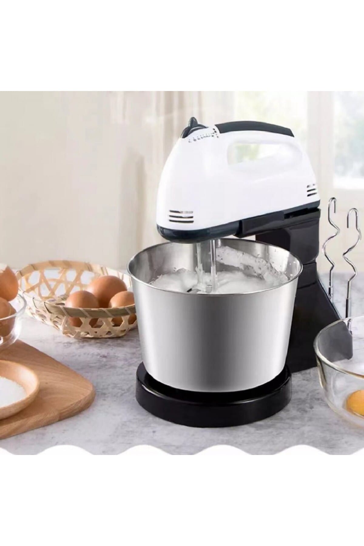 Facilitează prepararea rețetelor preferate cu acest mixer 2 în 1, echipat cu bol din inox și funcționalități avansate.; Ideal pentru amestecuri, bătut spume sau frământat aluaturi, acest mixer este un ajutor indispensabil în orice bucătărie modernă.; Caracteristici generale:Funcție 2 în 1: Utilizare ca mixer de mână sau mixer fixat pe suport cu bol rotativ.; Putere optimă: Motor de 350W (în funcție de model), perfect pentru diverse preparate.; Bol din inox: Capacitate de 2L, rezistent și ușor de curățat.7 trepte de viteză: Permite ajustarea vitezei în funcție de consistența dorită.; Accesorii multiple: Include 2 teluri pentru bătut și 2 spirale pentru frământare.; Beneficii cheie:Versatilitate maximă: Potrivit pentru spume, creme, aluaturi sau alte preparate culinare.; Design robust: Bol din inox și suport stabil, ideal pentru utilizare zilnică.; Operare ușoară: Se manevrează simplu datorită mânerului ergonomic și comenzilor intuitive.; Curățare rapidă: Accesoriile și bolul din inox sunt ușor de spălat manual sau în mașina de spălat vase.; Specificații tehnice:Putere: 350WCapacitate bol: 2LMaterial bol: InoxTrepte de viteză: 7Alimentare: 220VCuloare: Alb/negruConținut pachet:1 x Mixer electric1 x Bol din inox (2L)2 x Teluri din inox2 x Spirale pentru frământare1 x Manual de utilizare