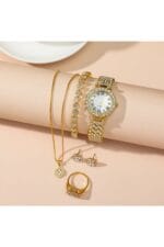 Descopera eleganta si tehnologia intr-un singur pachet exclusiv.; Acest Set Cadou Dama combina un smartwatch modern cu un ceas clasic auriu si set complet de bijuterii, oferind un cadou rafinat si complet pentru orice ocazie.; Smartwatch Performant (Tehnologie si Sanatate)Smartwatch-ul inclus este un dispozitiv multifunctional, perfect pentru activitatile zilnice.; Ecran Generos: Dispune de un Ecran de 2.01 inch cu atingere completa (Full Touch).; Conectivitate: Utilizeaza Bluetooth 5.3 pentru o conexiune stabila si rapida.; Monitorizare Sanatate: Ofera monitorizare completa a sanatatii: puls, tensiune arteriala, oxigen (SpO2), somn si ECG.; Functii Inteligente: Permite apeluri si muzica prin Bluetooth, notificari SMS si din aplicatiile sociale, alarma, control muzica si camera, si acces la asistent vocal (Siri).; Fitness Avansat: Include numararea pasilor, caloriilor arse, sport tracking si remindere pentru activitate si hidratare.; Incarcare: Baterie de 190 mAh cu incarcare wireless rapida.; Functii Suplimentare: NFC, mod zbor, vreme si contacte favorite.; Accesorii Incluse (Bijuterii si Eleganta)Setul este completat de accesorii clasice, perfecte pentru evenimente speciale.; Ceas Clasic: Include un Ceas Clasic Auriu decorat cu pietre stralucitoare, oferind un design elegant si feminin.; Set Bijuterii: Setul este completat de Bratara, Colier si Inel (mentionat in titlu, inclusiv cercei in descriere), fiind gata de oferit.; Avantaje CheieCadoul Ideal: Combina perfect stilul, tehnologia si rafinamentul pentru femeile moderne.; Ambalaj: Set complet, ambalat elegant.; Specificatii CheieSmartwatch Ecran: 2.01 InchCeas Clasic: Auriu cu PietreFunctii Smart: Apeluri, Notificari, Puls, SpO2, ECGConectivitate: Bluetooth 5.3, Incarcare WirelessAccesorii: Bratara, Colier, Inel (Set Complet Bijuterii)Design: Clasic si Tehnologic