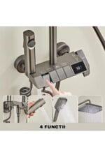 Transforma-ti dusul intr-o experienta de lux si siguranta cu acest Set Coloana Dus Termostatata, echipat cu afisaj digital al temperaturii si 4 functii de pulverizare.; Designul negru mat ofera o estetica moderna si eleganta, perfecta pentru baile contemporane.; Control Precis si Siguranta TermicaSistemul termostatat si afisajul digital asigura confort si previn arsurile.; Afisaj Digital LED: Afiseaza temperatura apei in timp real, permitand reglarea precisa si eliminand riscul de arsuri.; Termostatat: Mentine constanta temperatura apei, indiferent de fluctuatiile de presiune.; Comanda Intuitiva: Butoane de control usor de folosit pentru comutarea rapida intre functii.; Versatilitate 4-in-1 si PerformantaSetul ofera optiuni multiple de pulverizare pentru a satisface orice preferinta.4 Functii de Pulverizare: Include:Dus Superior Fix (Tip Ploaie): Jet larg si relaxant.; Dus de Mana: Pentru o utilizare tintita si flexibila.; Jet Inferior (Robinet): Pentru umplerea rapida a recipientelor.; Jet de Masaj/Bideu: Pentru curatare sau relaxare localizata.; Tehnologie Economie Apa: Conceput pentru a oferi un jet puternic, dar cu un consum optimizat de apa.; Design Modern si DurabilitateFinisajul negru mat si materialele de inalta calitate asigura un aspect premium si rezistenta indelungata.; Finisaj: Negru Mat (rezistent la zgarieturi si amprente).; Material: Construit din alama sanitara si alte materiale rezistente la coroziune.; Montaj: Pe perete, cu accesorii incluse.; Specificatii CheieNumar Functii: 4Control: Termostatat si DigitalAfisaj: LED TemperaturaFinisaj: Negru MatUtilizare: Baie