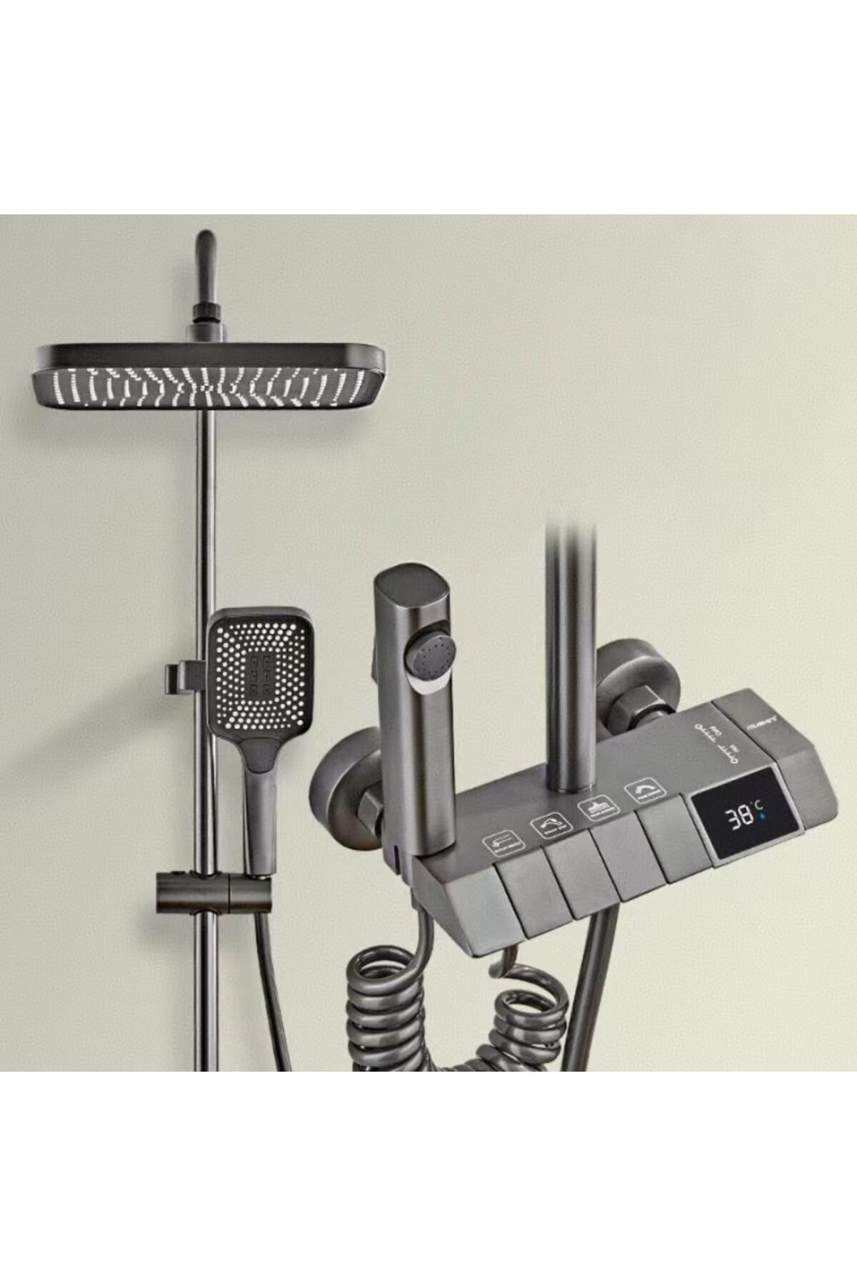 Transforma-ti dusul intr-o experienta de lux si siguranta cu acest Set Coloana Dus Termostatata, echipat cu afisaj digital al temperaturii si 4 functii de pulverizare.; Designul negru mat ofera o estetica moderna si eleganta, perfecta pentru baile contemporane.; Control Precis si Siguranta TermicaSistemul termostatat si afisajul digital asigura confort si previn arsurile.; Afisaj Digital LED: Afiseaza temperatura apei in timp real, permitand reglarea precisa si eliminand riscul de arsuri.; Termostatat: Mentine constanta temperatura apei, indiferent de fluctuatiile de presiune.; Comanda Intuitiva: Butoane de control usor de folosit pentru comutarea rapida intre functii.; Versatilitate 4-in-1 si PerformantaSetul ofera optiuni multiple de pulverizare pentru a satisface orice preferinta.4 Functii de Pulverizare: Include:Dus Superior Fix (Tip Ploaie): Jet larg si relaxant.; Dus de Mana: Pentru o utilizare tintita si flexibila.; Jet Inferior (Robinet): Pentru umplerea rapida a recipientelor.; Jet de Masaj/Bideu: Pentru curatare sau relaxare localizata.; Tehnologie Economie Apa: Conceput pentru a oferi un jet puternic, dar cu un consum optimizat de apa.; Design Modern si DurabilitateFinisajul negru mat si materialele de inalta calitate asigura un aspect premium si rezistenta indelungata.; Finisaj: Negru Mat (rezistent la zgarieturi si amprente).; Material: Construit din alama sanitara si alte materiale rezistente la coroziune.; Montaj: Pe perete, cu accesorii incluse.; Specificatii CheieNumar Functii: 4Control: Termostatat si DigitalAfisaj: LED TemperaturaFinisaj: Negru MatUtilizare: Baie