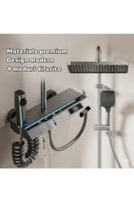 Transforma-ti baia cu acest Set de Dus Digital modern, ce imbina designul minimalist cu tehnologia avansata.; Sistemul ofera o experienta de utilizare premium si este echipat cu 4 functii de curgere tip Piano si afisaj digital al temperaturii in timp real.; Functionalitate 4-in-1 si Control IntuitivSistemul permite comutarea rapida intre patru surse de apa, oferind optiuni complete pentru igiena si relaxare.4 Moduri de Curgere: Comanda facila cu butoane tip piano pentru selectarea a:Cap de Dus Tip Ploaie: Pulverizare larga si uniforma, pentru o senzatie similara cu ploaia naturala.; Dus de Mana Multifunctional: Trei tipuri de pulverizare (spray concentrat, ploaie relaxanta, mixt), ajustabile printr-un singur buton.; Jet Inferior (Robinet Ascuns): Ideal pentru umplerea rapida a recipientelor.; Jet Spray Lateral: Jet puternic, util pentru curatarea baii sau igiena personala.; Tehnologie Digitala si Economisire ApaPanoul de control ofera siguranta si precizie, in timp ce sistemul de injectie cu aer contribuie la un consum eficient.; Afisaj Digital: Panoul frontal afiseaza temperatura apei in timp real, permitand ajustarea precisa si sigura a caldurii.; Economisire Apa: Sistemul de injectie cu aer face jetul de apa mai voluminos si placut, reducand in acelasi timp consumul real de apa.; Presiune Ridicata: Asigura presiune ridicata, chiar si in conditii de debit redus.; Materiale Premium si Design ElegantConstruit din materiale de inalta calitate, sistemul garanteaza durabilitate si un aspect modern.; Materiale Calitate: Corpul sistemului este realizat din aluminiu de tip space-grade, cu insertii din alama rezistente la coroziune.; Finisaj Modern: Finisajul Gri Grafit (Gun Metallic) confera un aspect elegant, usor de integrat in orice baie moderna.; Instalare Simpla: Instalare standard, compatibila cu majoritatea instalatiilor de baie.; Continutul Pachetului (Set Complet)Pachetul include toate componentele necesare pentru montaj si utilizare: Panou de control, tija principala, cap de dus superior (tip ploaie), dus de mana multifunctional, jet spray lateral, furtunuri flexibile, suport si set complet de montaj.