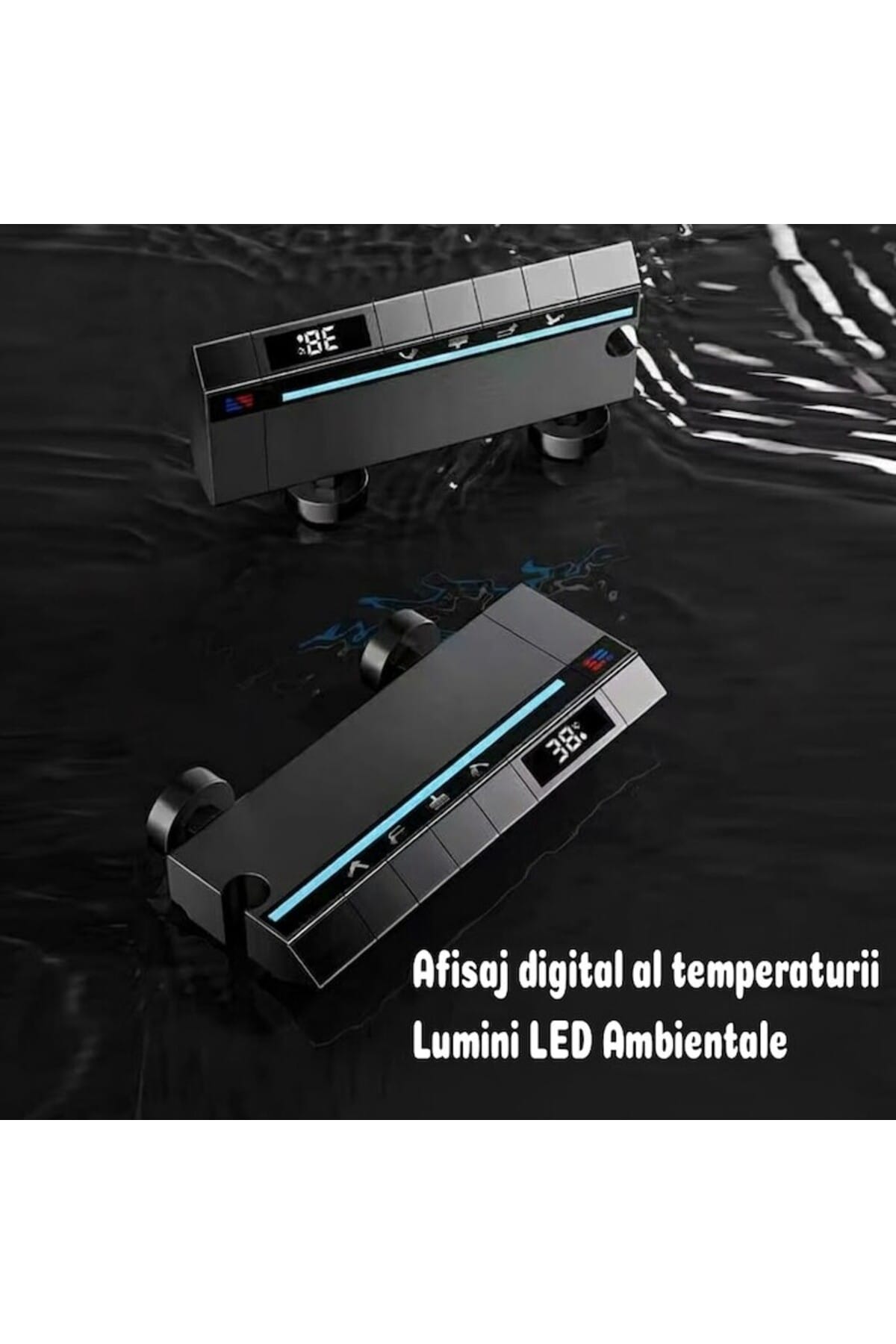 Transforma-ti baia cu acest Set de Dus Digital modern, ce imbina designul minimalist cu tehnologia avansata.; Sistemul ofera o experienta de utilizare premium si este echipat cu 4 functii de curgere tip Piano si afisaj digital al temperaturii in timp real.; Functionalitate 4-in-1 si Control IntuitivSistemul permite comutarea rapida intre patru surse de apa, oferind optiuni complete pentru igiena si relaxare.4 Moduri de Curgere: Comanda facila cu butoane tip piano pentru selectarea a:Cap de Dus Tip Ploaie: Pulverizare larga si uniforma, pentru o senzatie similara cu ploaia naturala.; Dus de Mana Multifunctional: Trei tipuri de pulverizare (spray concentrat, ploaie relaxanta, mixt), ajustabile printr-un singur buton.; Jet Inferior (Robinet Ascuns): Ideal pentru umplerea rapida a recipientelor.; Jet Spray Lateral: Jet puternic, util pentru curatarea baii sau igiena personala.; Tehnologie Digitala si Economisire ApaPanoul de control ofera siguranta si precizie, in timp ce sistemul de injectie cu aer contribuie la un consum eficient.; Afisaj Digital: Panoul frontal afiseaza temperatura apei in timp real, permitand ajustarea precisa si sigura a caldurii.; Economisire Apa: Sistemul de injectie cu aer face jetul de apa mai voluminos si placut, reducand in acelasi timp consumul real de apa.; Presiune Ridicata: Asigura presiune ridicata, chiar si in conditii de debit redus.; Materiale Premium si Design ElegantConstruit din materiale de inalta calitate, sistemul garanteaza durabilitate si un aspect modern.; Materiale Calitate: Corpul sistemului este realizat din aluminiu de tip space-grade, cu insertii din alama rezistente la coroziune.; Finisaj Modern: Finisajul Gri Grafit (Gun Metallic) confera un aspect elegant, usor de integrat in orice baie moderna.; Instalare Simpla: Instalare standard, compatibila cu majoritatea instalatiilor de baie.; Continutul Pachetului (Set Complet)Pachetul include toate componentele necesare pentru montaj si utilizare: Panou de control, tija principala, cap de dus superior (tip ploaie), dus de mana multifunctional, jet spray lateral, furtunuri flexibile, suport si set complet de montaj.