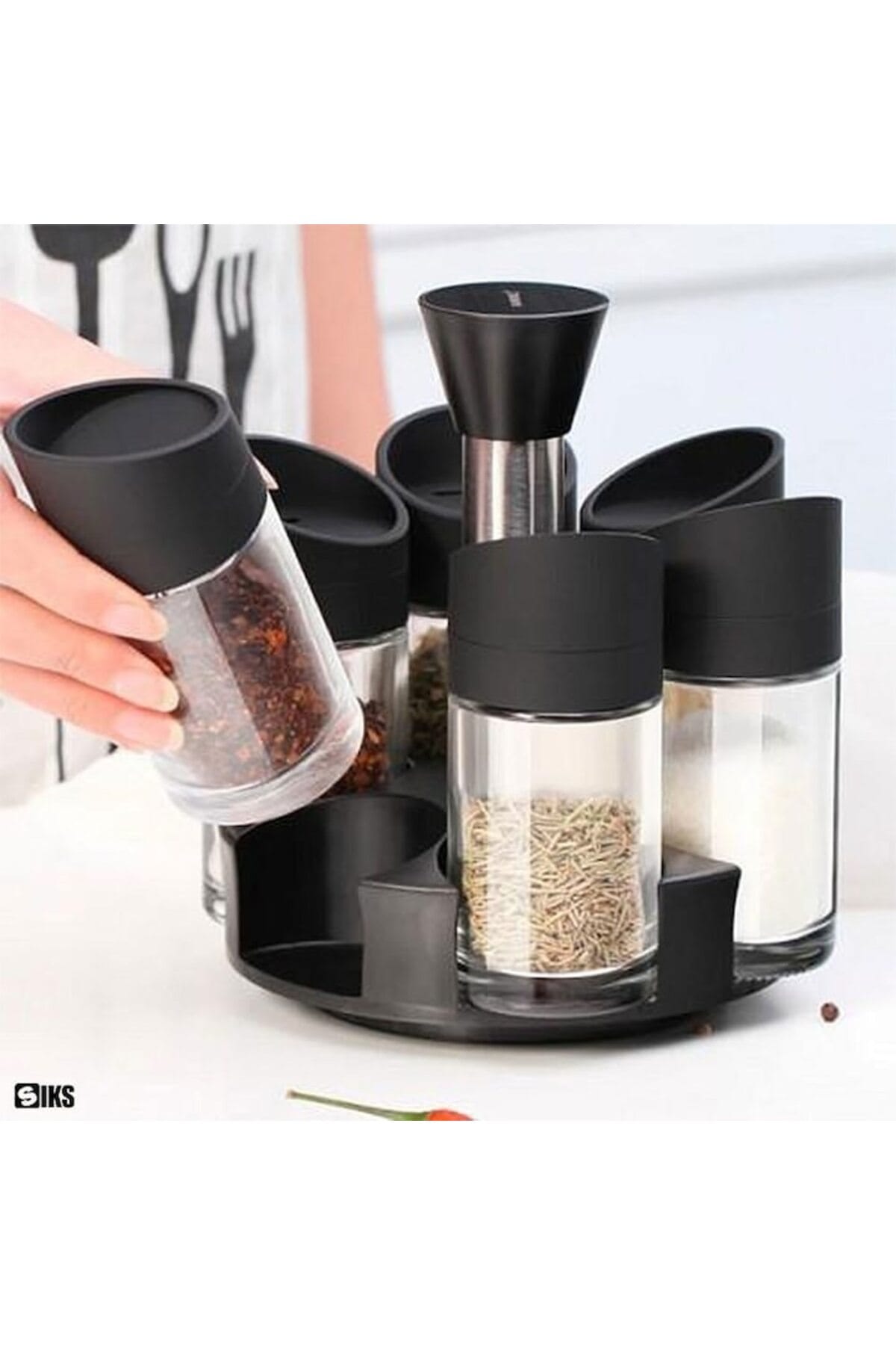 Transforma-ti bucataria intr-un spatiu organizat si stilat cu acest Set de Recipiente pentru Condimente dotat cu suport rotativ 360°.; Ideal pentru depozitarea sarii, piperului, zaharului si a ierburilor aromatice, acest set combina designul modern cu functionalitatea de top.; Design Elegant si Calitate SuperioaraSetul este conceput pentru a oferi igiena maxima si acces rapid.; Suport Rotativ 360°: Baza stabila care se roteste 360°, permitand acces rapid la fiecare recipient fara a cauta printre ele.; Recipiente: Include 6 borcane din sticla transparenta care permit vizualizarea usoara a continutului si a cantitatii ramase.; Material: Fabricat din material de calitate superioara (plastic pentru capace si sticla pentru borcane) si beneficiaza de finisaje deosebit de fine.; Dozare Precisa si EtanseitateCapace Etanse: Capacele sunt prevazute cu filet pentru o buna etansare, pastrand prospetimea si aroma condimentelor mai mult timp.; Dozare Fina/Mare: Capacele sunt dotate cu 3 tipuri de gauri pentru dozare (dozare fina sau mare), asigurand o deschidere precisa.; Usor de Curatat si Reumplut: Recipientele din sticla se spala rapid, iar capacele se desurubeaza cu usurinta.; Dimensiuni si UtilizareDimensiune Compacta: 18 × 16 × 12 cm, perfect pentru blat, dulap sau masa.; Ideal pentru: Bucataria de acasa, restaurante, sau ca un cadou practic pentru pasionatii de gatit.; Specificatii CheieSet: 6 RecipienteSuport: Rotativ 360°Material Recipiente: Sticla TransparentaDozare: Capace cu 3 Tipuri de GauriDimensiuni: 18 × 16 × 12 cmUtilizare: Organizare Condimente, Sarbatoare, Zahar, Ierburi